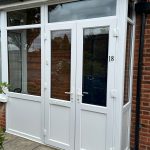 A smart installation of a Solidor Tenby 4 design front entrance door in a pretty Painswick along with a side window was completed in Enfield. Finished with a beautiful Simplicity glass design, brushed aluminium finger pulls, doctors knocker, architectural letterplate and a Heritage AV2 locking system.